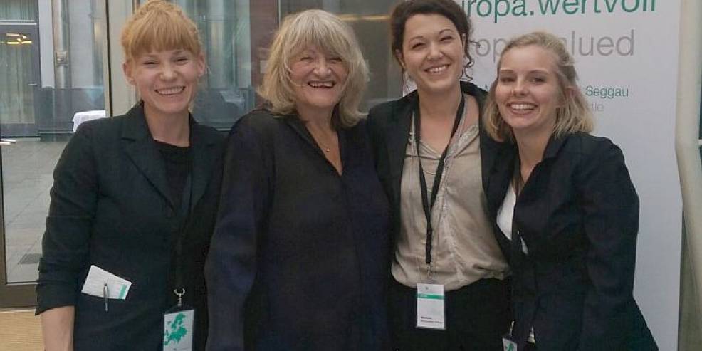 Das sind, von links: Katharina Steinbrecher, Michaela Hronovsky-Ortner und Marie Pircher. Sie haben Alice auf dem „Pfingstdialog Steiermark“ getroffen, wo sie über die steigende Gefahr der islamistischen Agitation in Europa gesprochen hat. Die drei Frauen sind Mitarbeiterinnen des Orga-Teams. Und diesmal hatten sie noch eine Sonderaufgabe dazu: Den rund 200 ReferentInnen und StipendiatInnen des Dialogs EMMA-Hefte anzubieten. Oder noch besser: Sie von einem EMMA-Abo zu überzeugen. Beides ist den dreien hervorragend gelungen. Die erste Abonnentin war Marie selber! Darüber hat Alice sich natürlich besonders gefreut. Denn in der schönen Steiermark, die an Slowenien grenzt, gibt es noch nicht genug EMMA-AbonnentInnen.
