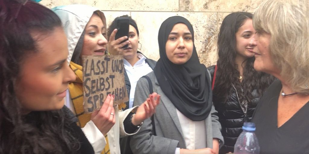 Ich hatte in der Konferenz über den Siegeszug des politisierten Islam gesprochen: ausgehend von Khomeinis Gottesstaat Iran ab 1979 bis in die islamischen Communities im Herzen Europas. Als einzige Referentin der Konferenz war ich dann irgendwann im Laufe des Tages durch den Nieselregen auf die andere Straßenseite gegangen, um mit den DemonstrantInnen zu sprechen. Etwa ein Dutzend Frauen, plus ein, zwei Männer. Es empfing mich Gebrüll. Ich ließ mich nicht entmutigen, versuchte zu verstehen und zu diskutieren. Dabei tippte ich einer kopftuchtragenden Demonstrantin ganz leicht an den linken Arm. Noch mehr Gebrüll. Rassistin! Frauenfeindin! „Wie können Sie es wagen, mich ohne Erlaubnis anzufassen? Ich zeige Sie an!“, schrie die Betroffene. Darauf antwortete ich ironisch: „Ich dachte, nur Männer dürfen Sie nicht anfassen.“