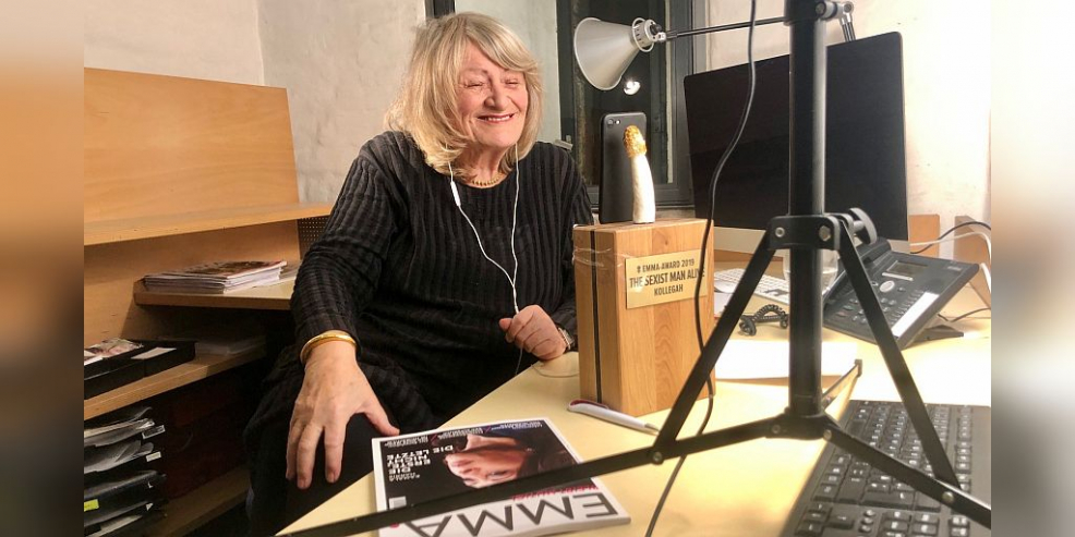 Alice beim Instragram-Talk mit Hans Sigl, dem „Bergdoktor“. Zugegeben, ihr Handyhalter ist der Sexist-Man-Alive-Award von 2019, den EMMA im letzten Jahr dem Rapper Kollegah verliehen hatte ). Aber da der ihn nie abgeholt hat... Das ganze Gespräch über 73(!) Minuten zwischen Hans Sigl und Alice Schwarzer auf Instagram.