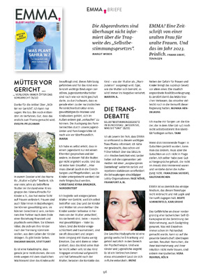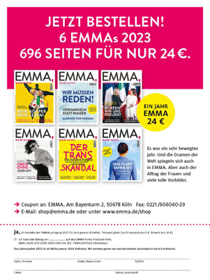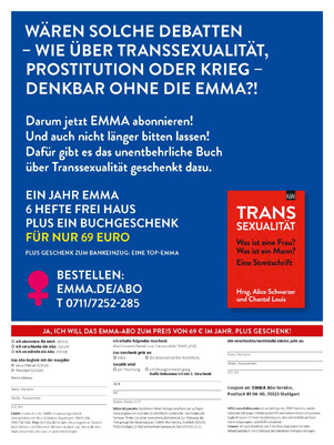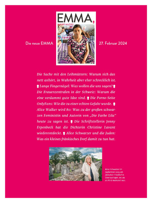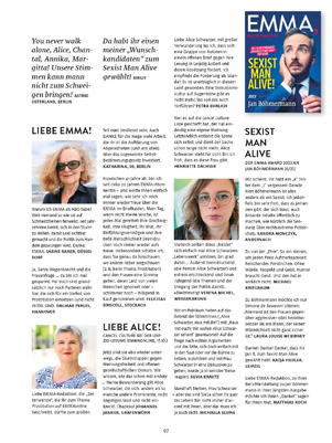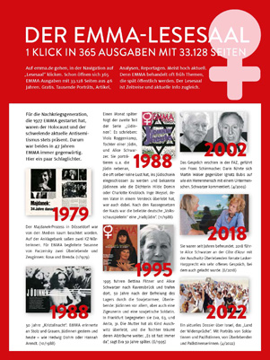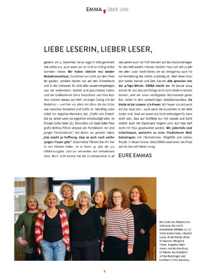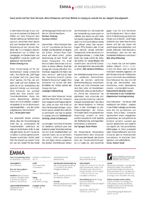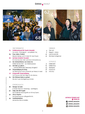 Schön, dass Sie so aufmerksam die EMMA lesen. Stimmt. Ich war in der ersten Nummer der EMMA 1977 zusammen mit Kolleginnen auf dem Cover und zum 20-Jahr-Jubiläum. Na und?