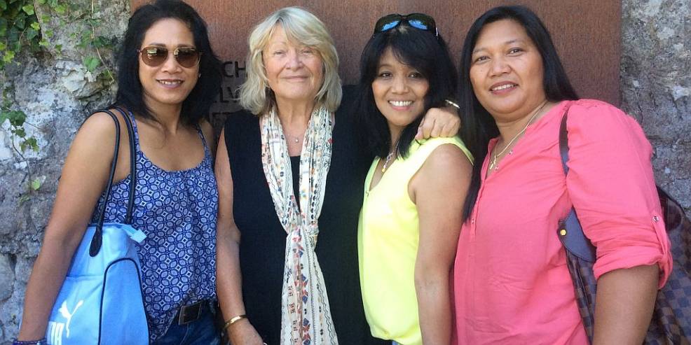Das sind (von li): Rafaele, Ofelia und Rolene. Alice hat die Philippininnen im brausenden Wasserstaub des Rheinfalls von Schaffhausen getroffen. Die drei Freundinnen haben einen Ausflug "unter Frauen" gemacht. Sie leben seit über zwanzig Jahren im Schwarzwald, sind mit deutschen Männern verheiratet und haben "schon erwachsene Kinder". Alice kannten sie vom Fernsehen und "finden ganz toll, dass Sie sich für Frauen einsetzen".