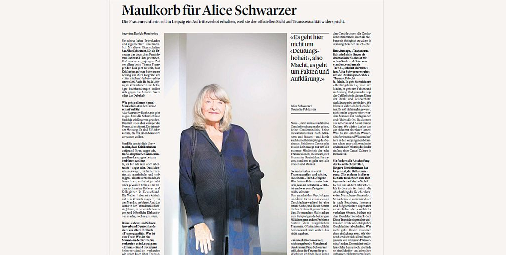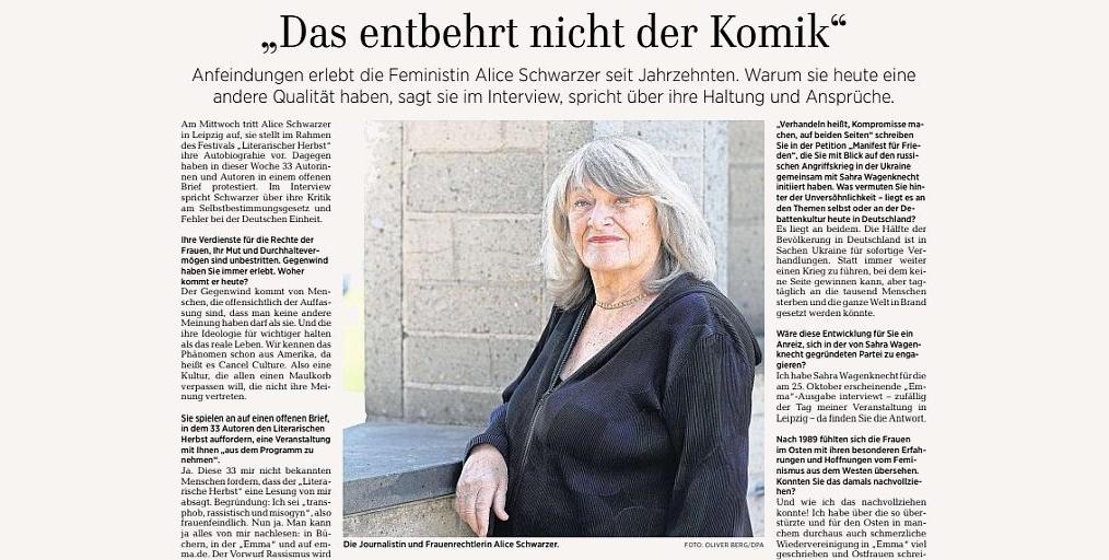 "Man hätte im Saal eine Stecknadel fallen hören können, als Alice Schwarzer zum Interview Platz nahm. Schwarzer, die streitbare Journalistin, die bereits Aktivistin war, als es das Wort noch nicht gab", so Franca Lehfeldt nach der Veranstaltung in Düsseldorf auf Instagram. "Alice Schwarzer ist der personifizierte Beitrag zu einer gepflegten Debattenkultur. Diskutieren statt Canceln." weiter